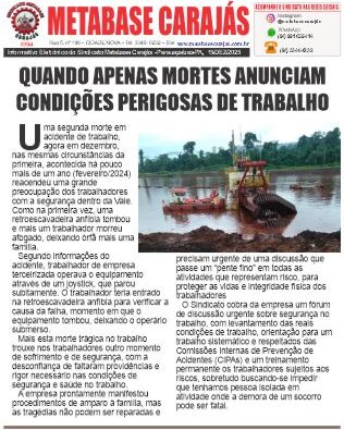 A direção do METABASE CARAJÁS participou nesta tarde com a Vale do “Fórum de Saúde e Segurança” onde foram apontados problemas antigos que continuam sem solução e que contribuem para um ambiente de trabalho onde riscos de acidentes acontecem, sobretudo numa atividade como a mineração.Tivemos o compromisso da empresa de manter mensalmente a realização dos…